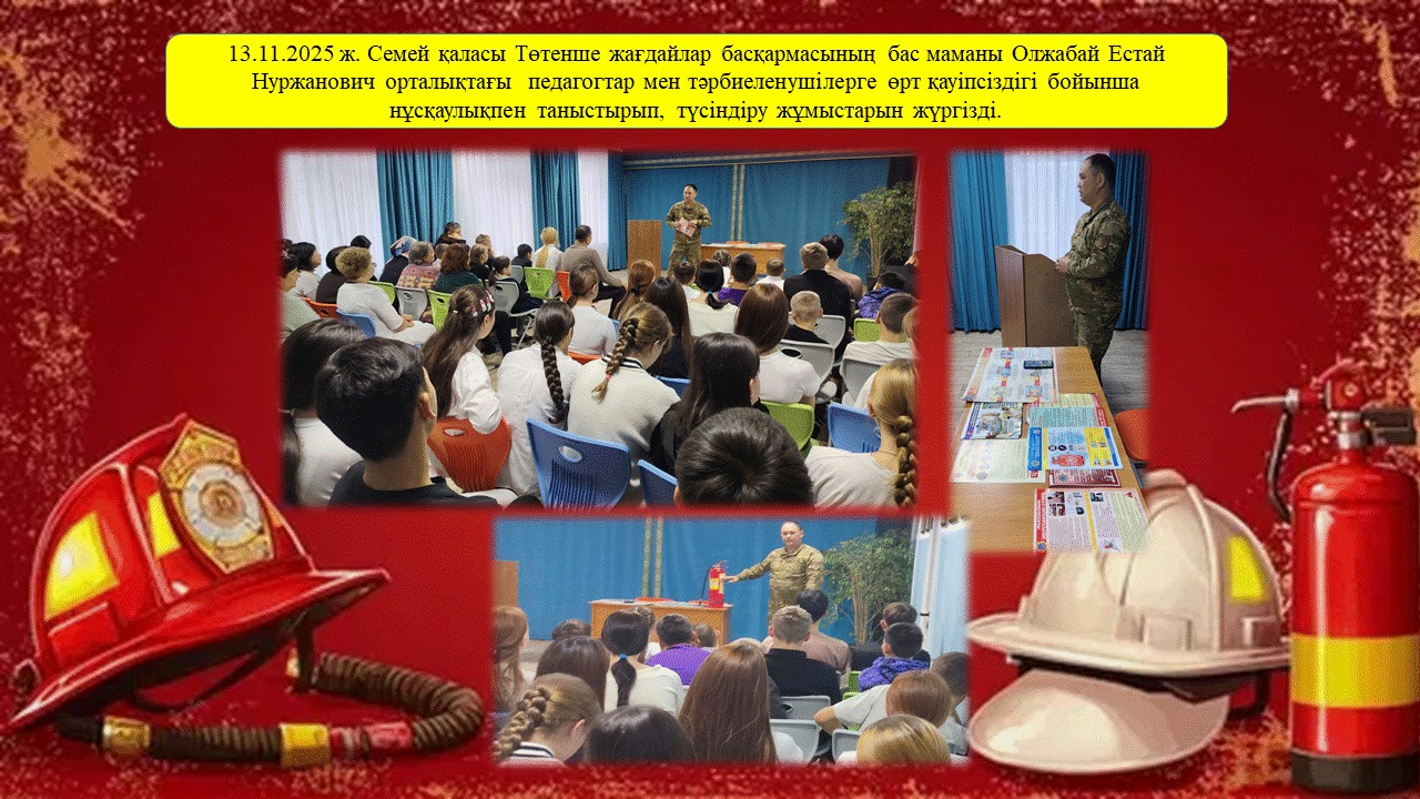 13.11.2025 ж. Семей қаласы Төтенше жағдайлар басқармасының бас маманы Олжабай Естай Нуржанович орталықтағы педагогтар мен тәрбиеленушілерге өрт қауіпсіздігі бойынша нұсқаулықпен таныстырып, түсіндіру жұмыстарын жүргізді.